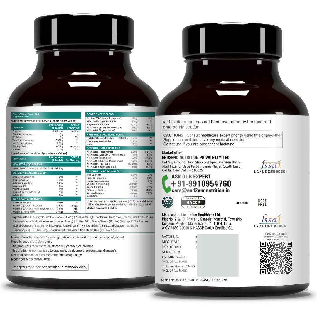 End2End Nutrition Multivitamin Tablets for Men and Women with Ginseng, Omega, Probiotics & Herbs (90 Tablets)